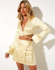 Our Baina top is perfect for adding a luxe vibe to your look. Featuring a cropped fit, long sleeves, v neckline with collar and a wrap around design in a satin buttercream. Style with our Nawa Skirt and knee high black boots for a chic co-ord.